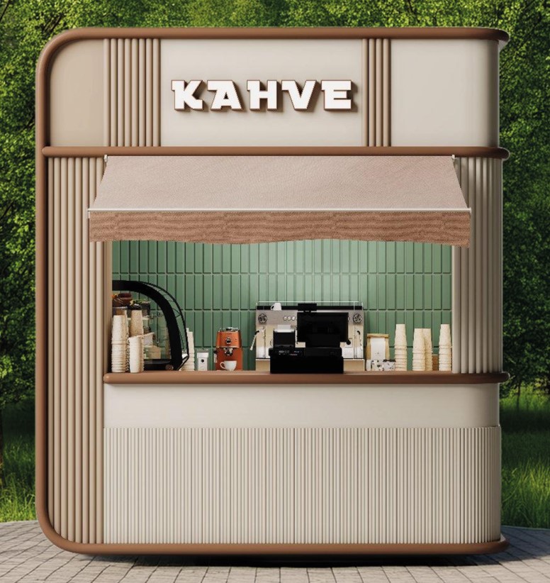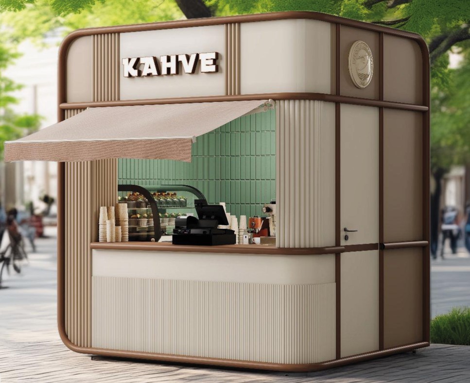 Modern tasarımı ve fonksiyonel yapısıyla dikkat çeken bu taşınabilir kahve kiosku, hem estetik hem de kullanım kolaylığı açısından öne çıkar. Kontrplak üzerine elyaf kaplamalı dış yüzeyi ve elektrostatik boyalı çerçeve detaylarıyla hem sağlam hem de şık bir dış görünüme sahiptir. Geniş iç hacmi, satış bankosu ve kasa alanı gibi detaylarla pratik bir kahve servisi deneyimi sunar.